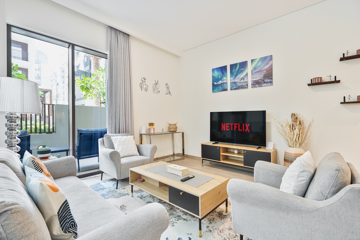 24/7 self-check-in! Arrive anytime! Responsive Hosts, Great Location! This is your ultimate Dubai Creek Beach private retreat! A brand-new, beautifully designed 1 bedroom apartment with sofa pullout to sleep 4, is situated 50 metres from Dubai Creek Lagoon in the heart of Dubai Creek Harbour, and right next to Vida Dubai Creek Hotel. Perfect quiet tranquility for business and family-friendly travelers with a private beach and Lagoon. 20 minutes from Downtown Dubai and Dubai Airport (DXB).