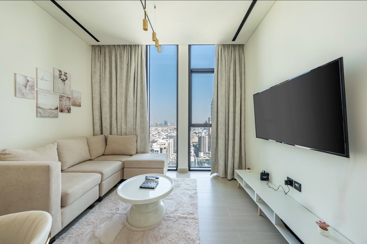 Experience luxury on the 40th floor at the 5 Star Paramount Midtown Hotel and Residence, Dubai near Downtown and Metro. This stylish 1-bedroom, 1.5-bathroom 65 (sqm) apartment offers stunning views of the Dubai Skyline and Ocean. Enjoy high class amenities, a fully equipped kitchen, and a cozy living room. Located in Business Bay, it's minutes from Dubai Mall and top attractions. Sleeps 5 (4 adults + 1 small kid). Includes high-speed Wi-Fi, TVs, private parking, and baby essentials upon request.