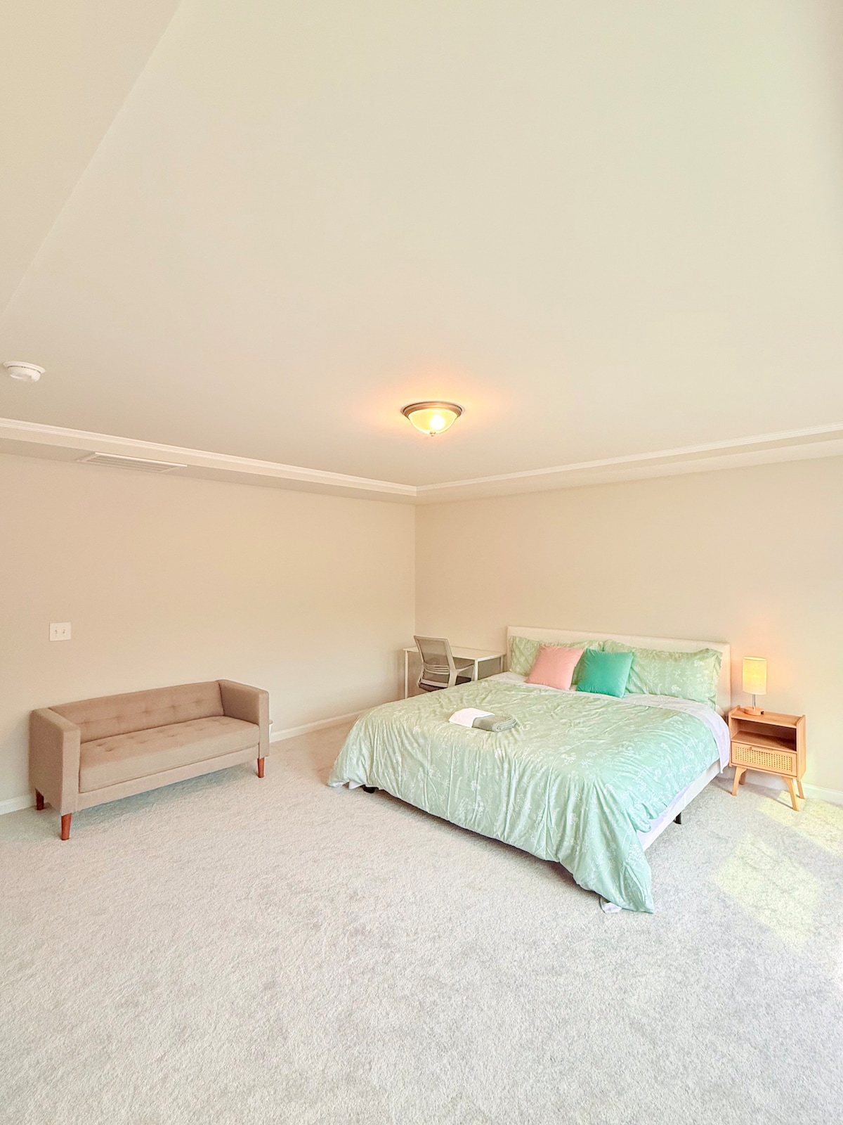 Welcome to our Private Luxury Master Suite! Enjoy a hotel-like experience with a spacious luxury bath featuring double sinks and a rain shower and a beautiful private deck with a peaceful view. We also include a coffee bar, work area, Wi-Fi, and TV. Conveniently located from RDU Airport and Downtown Durham, with a variety of restaurants and coffee shops nearby. Experience the perfect blend of comfort, luxury, and convenience in this upgraded suite! Parking is available and limited to 1.