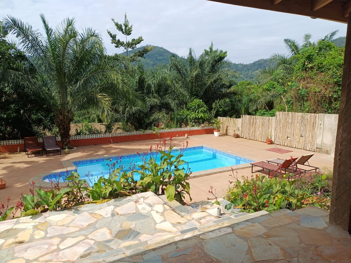 El lodge se encuentra cerca de la ciudad de Kpalimé y le ofrece venir a disfrutar de la tranquilidad, la naturaleza y la frescura de la montaña. Puede disfrutar de la villa que consta de un apartamento en la planta baja con sala de estar, un dormitorio, un baño privado y un inodoro independiente, cocina privada y un dormitorio en el primer piso con acceso que se realiza a través de una escalera exterior. Se pueden pedir comidas, desayuno de 3 euros.