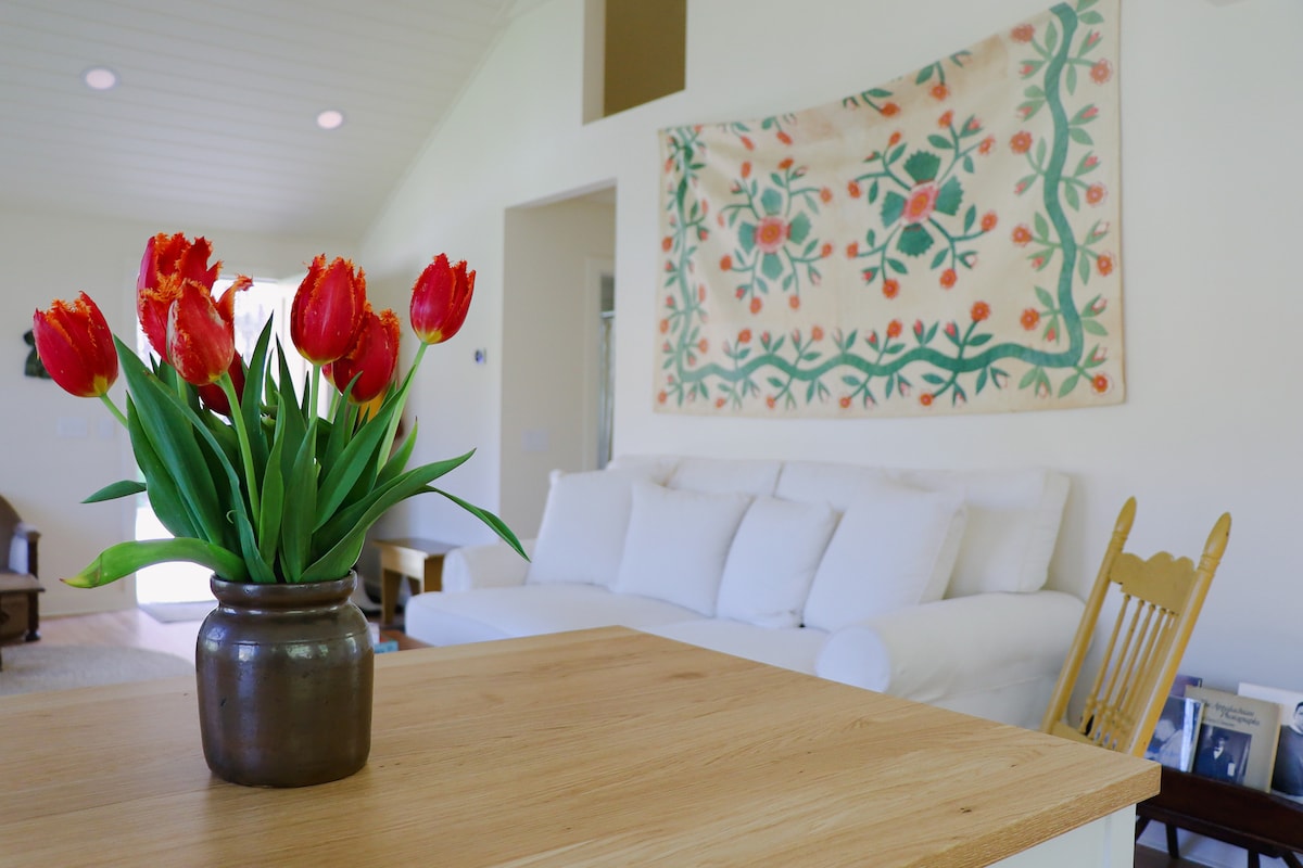 Nuestra casa está a poca distancia en coche de Hudson, Kinderhook o Chatham, Nueva York, y a diez minutos a pie del río Hudson y de un embarcadero. Disfruta de kilómetros de carreteras rurales para caminar y montar en bicicleta y de nuestros nueve acres a través de prados y bosques en senderos segados. Los huéspedes tienen acceso a una casa de campo de estilo Adirondack con vistas a un estanque. Cerca de numerosos restaurantes, galerías, tiendas de antigüedades y actividades culturales. Esta propiedad es buena para parejas, grupos de amigos y familias.