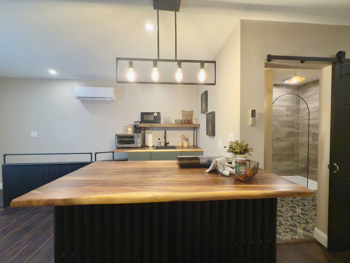 «Descansa un rato». Disfruta de nuestra suite privada para huéspedes que cuenta con una gran sala de estar principal donde también se encuentran la cocina pequeña y el comedor, un dormitorio separado y un baño privado. Esta suite se encuentra en el nivel inferior de nuestro rancho elevado y requiere la capacidad de usar seis escalones. Accede al alojamiento directamente mediante la entrada principal privada con teclado. Plaza de aparcamiento en la entrada con pasarela iluminada pavimentada hasta la entrada.