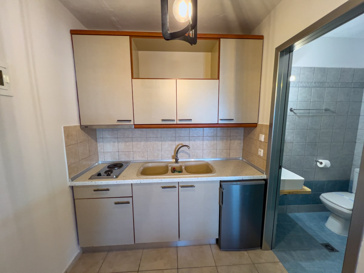 Un estudio sencillo, cálido y sencillo con aire acondicionado en la última planta del edificio en el centro de la ciudad, con balcón y toldo en un lado tranquilo del edificio. A 150 metros de la plaza principal de Komotini. Panadería a 20 metros, pizzería en el mismo edificio, cafetería tradicional y varias cafeterías y tiendas de buğatsa a 50 metros. Tiene todas las comodidades y un ordenador.