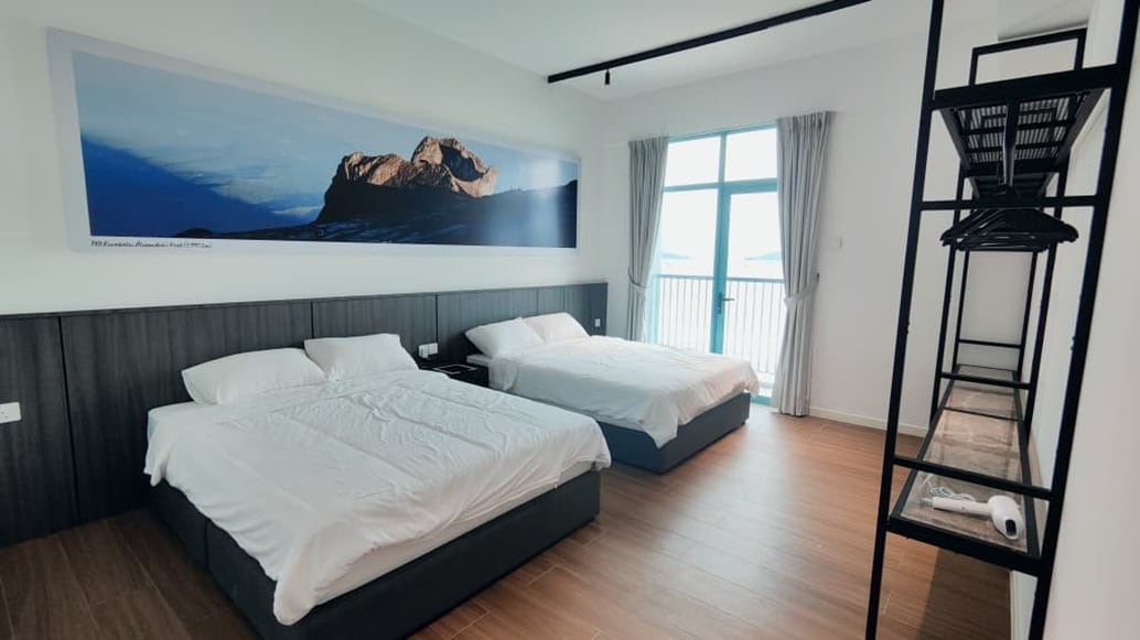 🍳Complimentary breakfast for 4 💡 For safety reasons, iron is not provided, but a garment steamer is available upon request ✔️ 15F 2BR unit w/ private balcony 🌊 Views: Likas Bay, Mt Kinabalu, KK Mosque & Tun Mustapha 🛏️ Master: 2 queen beds | Second: 2 singles (no windows) 🚿 Ensuite bathrooms & open wardrobes 🛋️ Living: sofa, 55" smart TV 🍳 Kitchenette: stove, hood, cutlery, cups 🍽️ Dining table for 2 ⚡ Fast WiFi