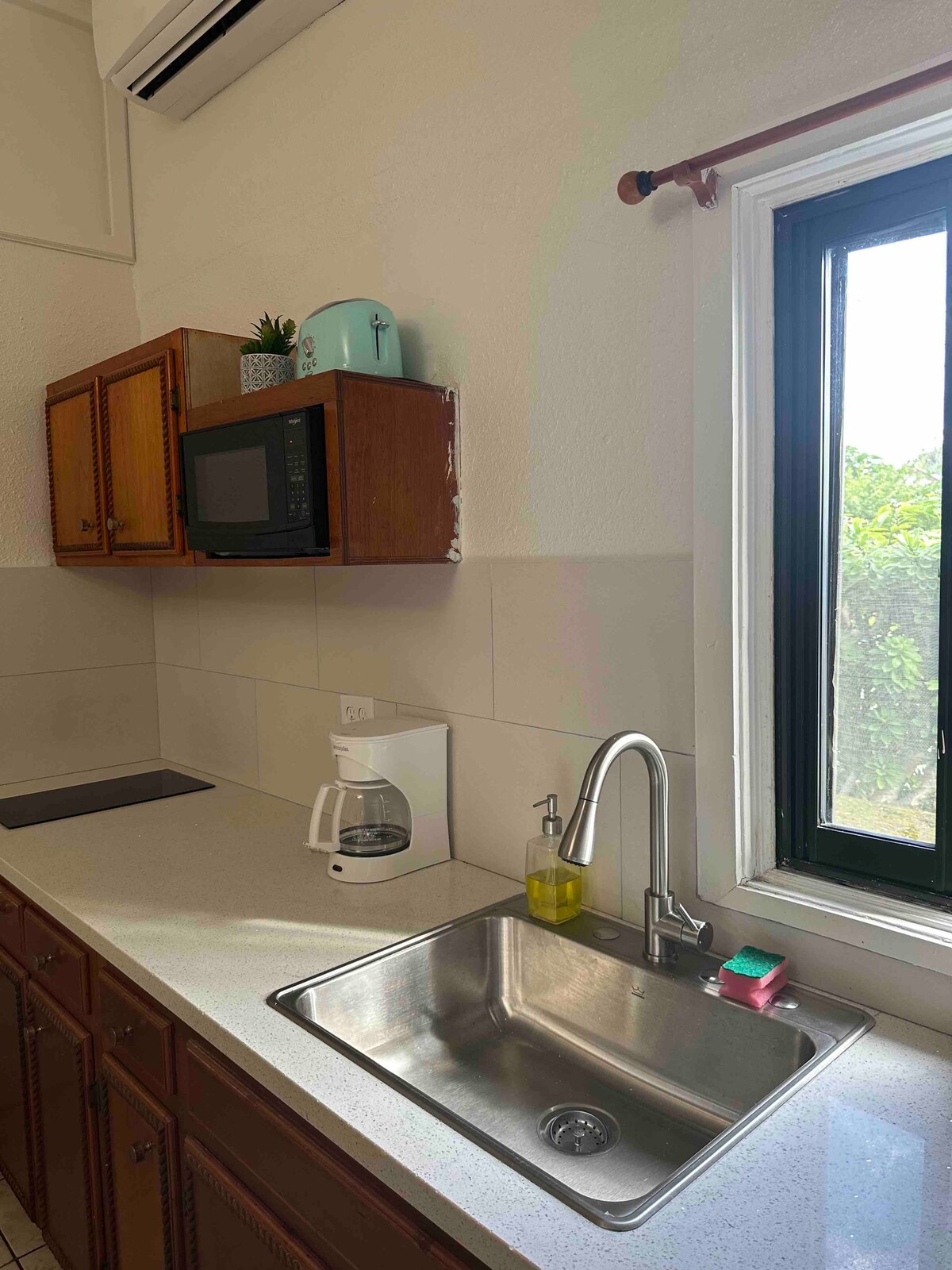 Acogedor apartamento estudio limpio decorado con una colección de arte local. La unidad es totalmente independiente con cocina americana y baño (con ducha) y una cama tamaño queen y un sofá cama tamaño king. Equipado con comodidades modernas como aire acondicionado, agua caliente, wifi, TV con Roku y una lavadora/secadora que funciona con monedas. Ubicado en el centro de un complejo privado y seguro, muy cerca del aeropuerto, campo de golf, tiendas principales y restaurantes populares.