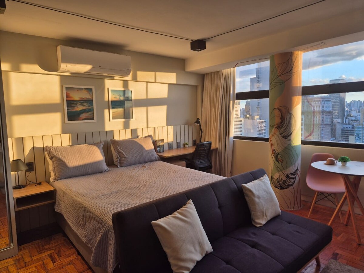 ¡Bienvenido! ¡Ubicado en el piso 17 del edificio histórico Mirante do Vale! Apartamento con excelente ubicación: a pie hasta el 25 de marzo, Rua José Paulino, Santa Efigênia, Galería do Rock, Rua das Noivas, Teatro Municipal, Mercado Municipal, Pinacoteca y más. Estudio amueblado, cama tamaño KING, cocina equipada, wifi rápido, ropa de cama y toallas, cafetera, televisor inteligente de 60 pulgadas y aire acondicionado. ¡Estaremos encantados de darle la bienvenida!