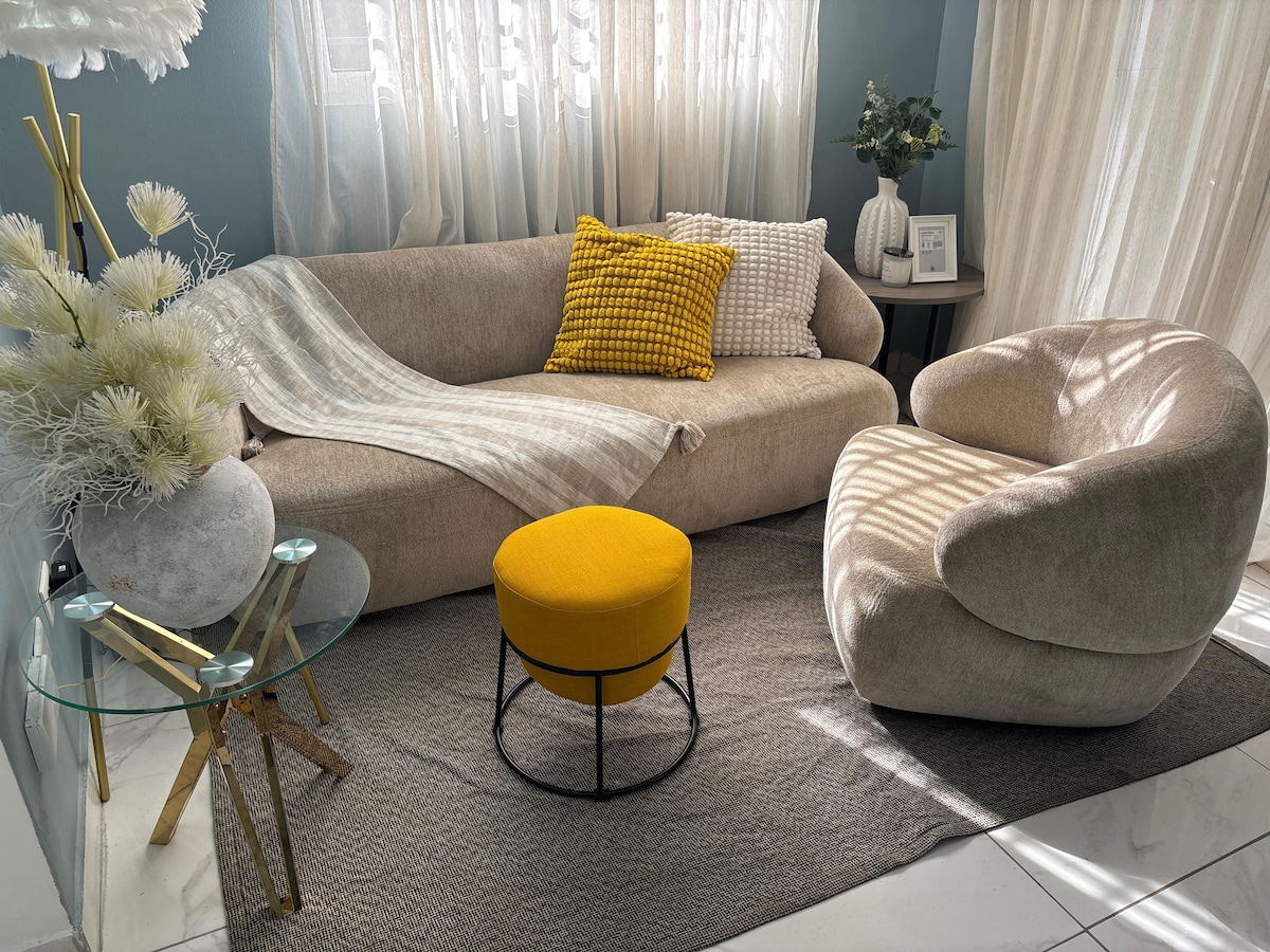 Este elegante alojamiento es ideal para viajes en grupo. -Una cama principal -Un sofá cama en la sala de estar. -Cocina -Aire acondicionado -Baño Está ubicado lejos del pesado tráfico, en un residencial tranquilo. Desde aquí estás a 30 minutos de la ciudad.