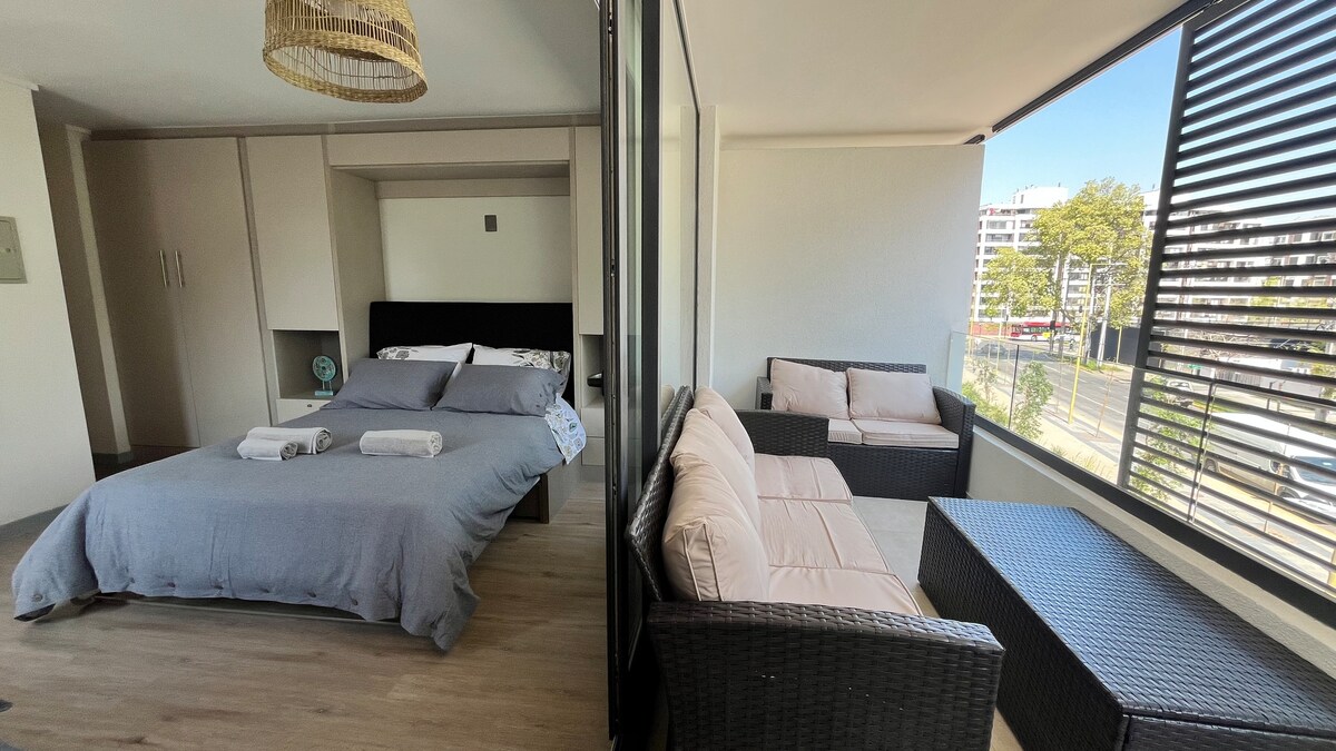Beautiful and comfortable studio apartment steps away from Parque Arauco and Clínica Alemana. Enjoy a cozy and comfortable stay in Las Condes. Our Hosts are 1 click away! -Surrounded by cafes, restaurants and luxury shops -Comfortable King bed and 2-seater sofa bed -Kitchen fully equiped -High speed internet -Outdoor and indoor heated pool -Gym -Security and controlled access Ideal for: Business or pleasure People looking for a safe and quiet location
