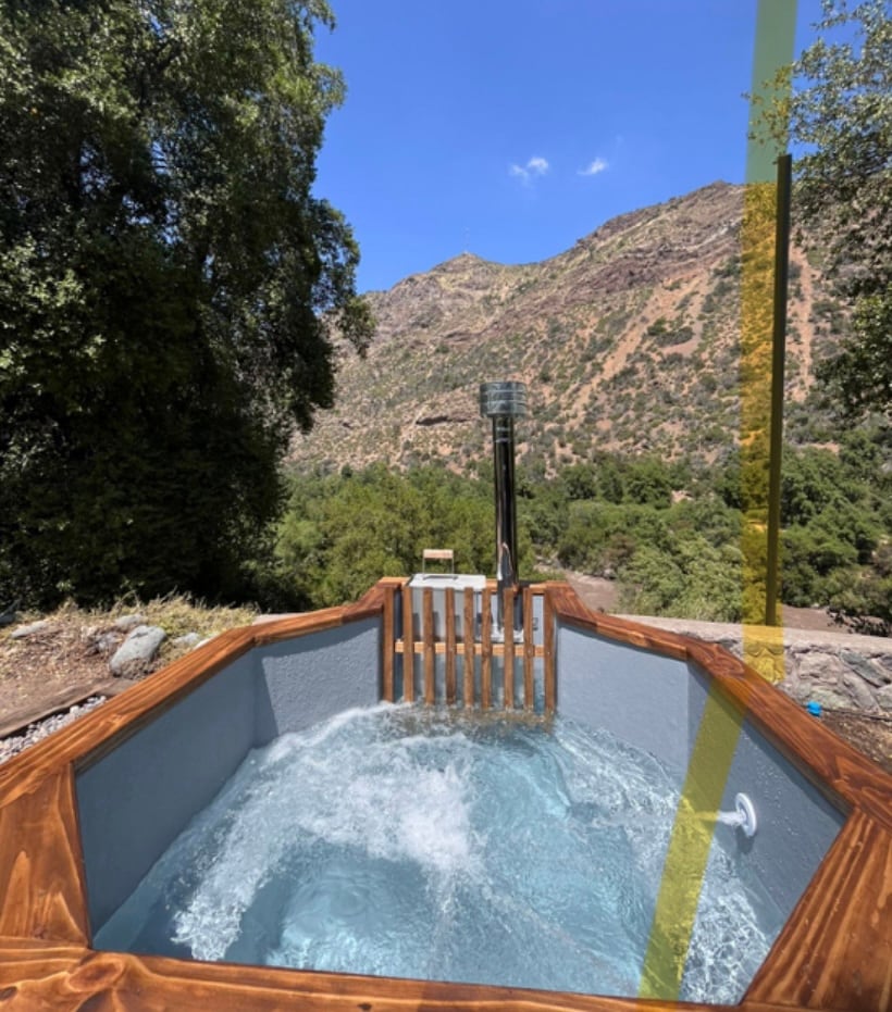 Pequeña cabaña rústica,de un ambiente, SIN cocina, con parrilla en la terraza.Inserta entre grandes arboles, a metros del rio Maipo con acceso exclusivo para la cabaña. Cuenta con terraza y estacionamiento privado. Alojamiento ideal para parejas y aventureros, tinaja con agua caliente en la terraza, para relajarte con el sonido del río bajo un cielo estrellado. La tinaja es de uso privado y sin horarios.