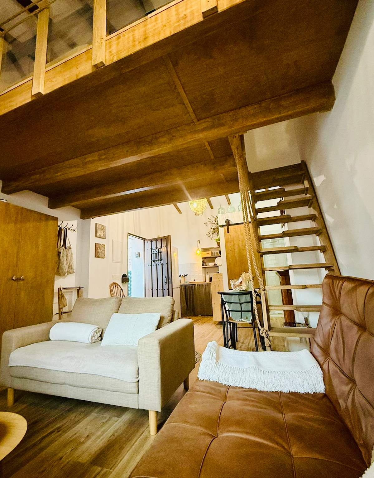 New apartment in a renovated 18th century building; the façade, the layout of the neighborhood patio and the gallery of the building, with wooden beams, maintain the physiognomy of popular Andalusian architecture. The apartment, of about 66 useful square meters, is a duplex type, so it has internal stairs. Access is made through the first floor, where there is a spacious living room, kitchen and a toilet. On the ground floor is the bedroom and bathroom of the house.