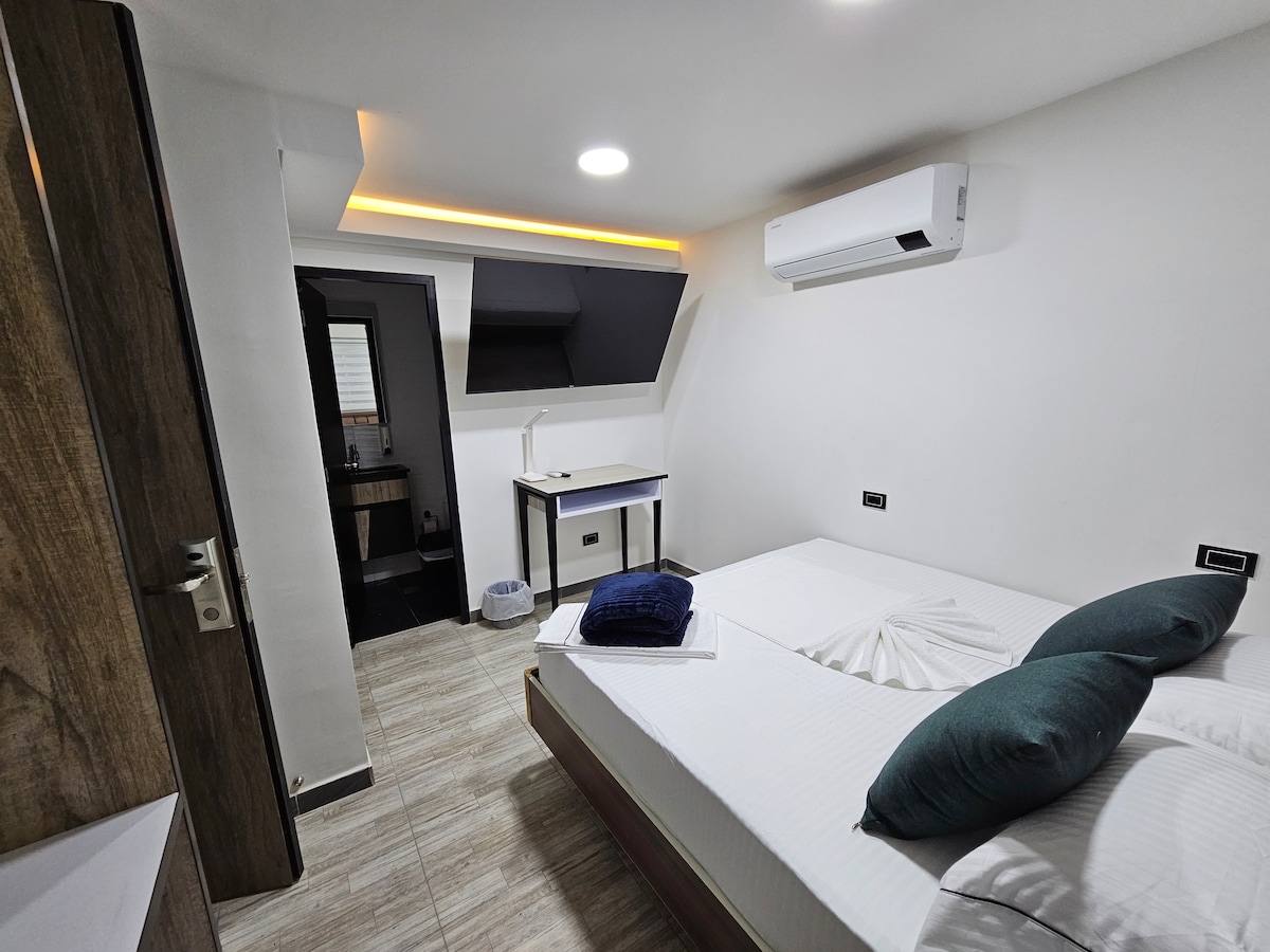 Enjoy a unique stay in this cozy queen room located in the garage area of Soul Lifestyle Apartments. The room offers a comfortable queen bed, a work desk, a private bathroom, a TV, and a coffee maker. Step out onto the small terrace for a breath of fresh air. This space is ideal for guests looking for a budget-friendly stay with all the essentials.spacio para quedarte.