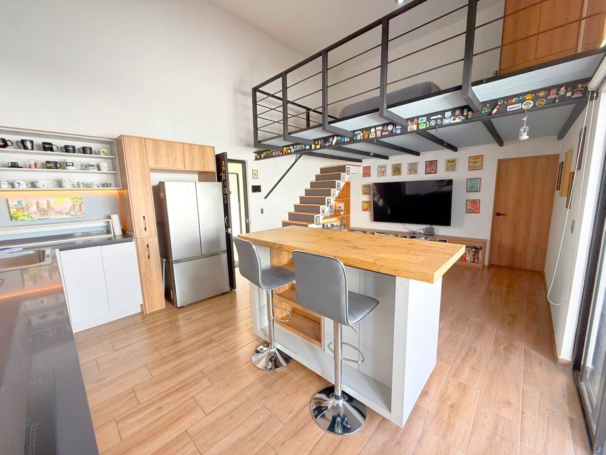 Hermoso Departamento con amplia terraza, limpio y muy acogedor. la construcción es nueva, así como los muebles que hay en su interior. el departamento es de concepto abierto, solo hay un biombo que separa el área del dormitorio con la sala, para dar un poco de privacidad. Hay un sofá cama, tamaño matrimonial, en la sala El departamento tiene amplias ventanas que brindan una excelente iluminación. y cuenta con una linda terraza, rodeada de plantas.