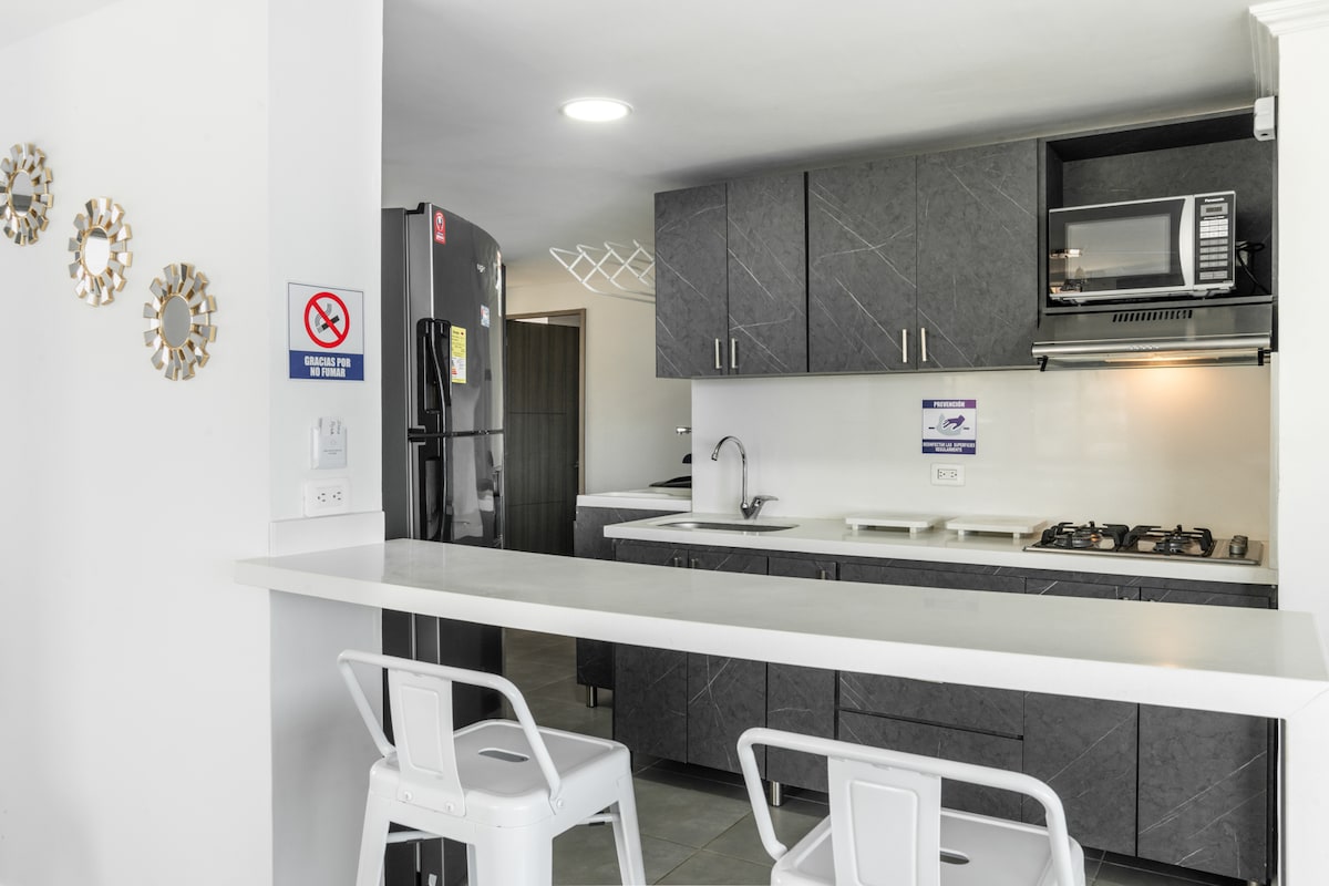 A solo pasos de la playa, disfruta de un apartamento ideal para vivir el encanto de Santa Marta. Relájate con cocina equipada, aire acondicionado, wifi rápido, lavadora y TV. Vive la magia del Caribe sintiéndote como en casa. Importante: al llegar tendrás que pagar una manilla obligatoria del edificio ($12.000 COP por persona) y, en caso de pérdida de la tarjeta de acceso, se cobrará reposición. Medidas pensadas para tu seguridad y tranquilidad.