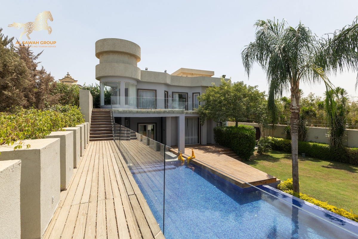 El alojamiento de la villa ofrece aire acondicionado y un balcón. Esta villa ofrece piscina privada, jardín, instalaciones de barbacoa, wifi gratuito y aparcamiento privado gratuito. Hay (6) dormitorios en la villa, una sala de estar, TV de pantalla plana vía satélite, una cocina equipada y (7) baños con bidé y ducha, así como una terraza y vistas a la ciudad. Hay toallas y sábanas disponibles en la villa. Los huéspedes pueden disfrutar de la piscina cubierta. El alojamiento de la villa está a 23 km de las pirámides de Guiza. El aeropuerto internacional Sphinx está a 25 km de la propiedad.