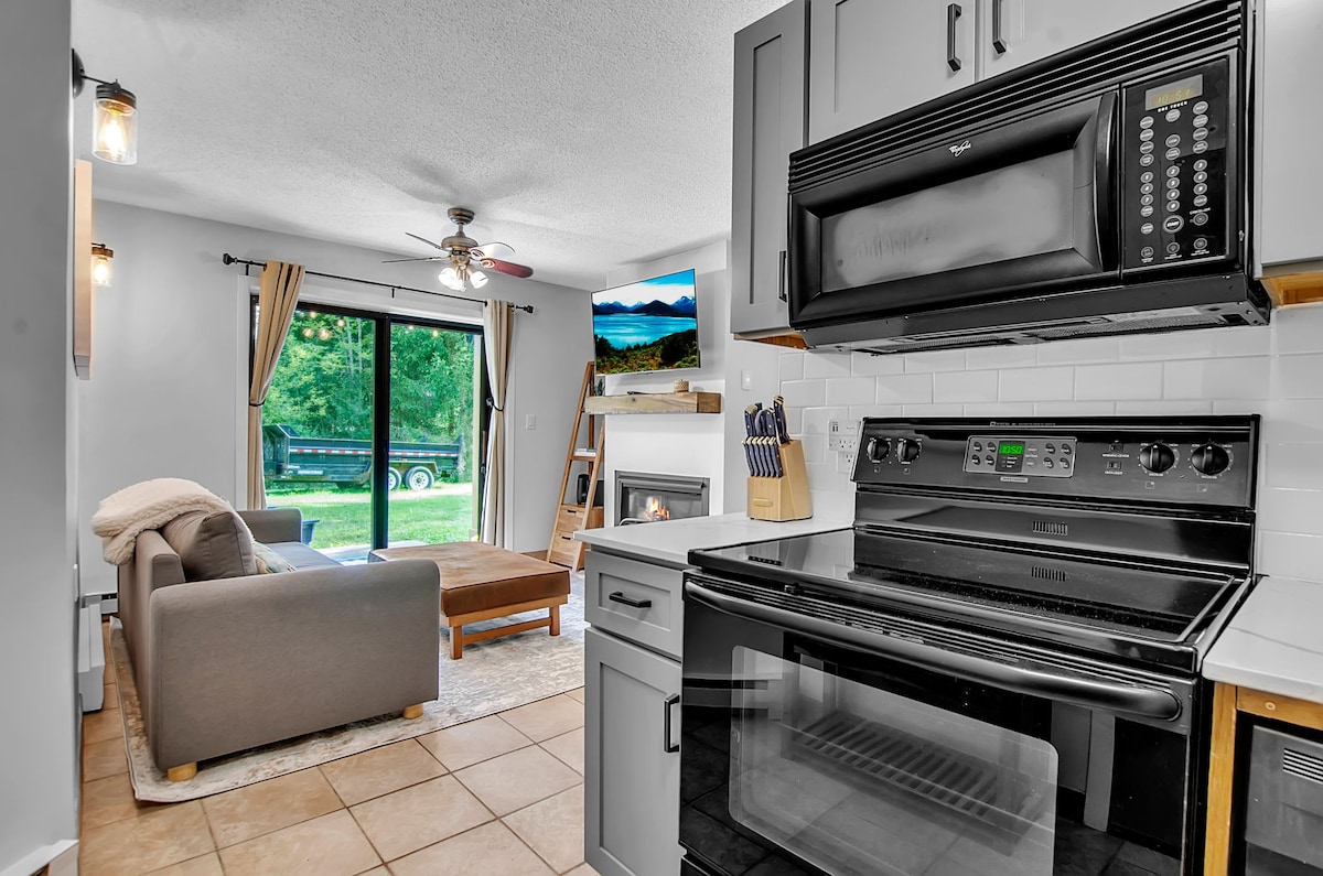 ¡Disfruta de la mejor escapada de esquí en este apartamento completamente remodelado! 1 dormitorio con una cama tamaño queen, un sofá cama completo y un baño completo moderno, este espacio es perfecto para familias o parejas. La cocina totalmente equipada cuenta con electrodomésticos de acero inoxidable, mientras que la gran televisión y la chimenea de gas crean un ambiente acogedor para relajarse.