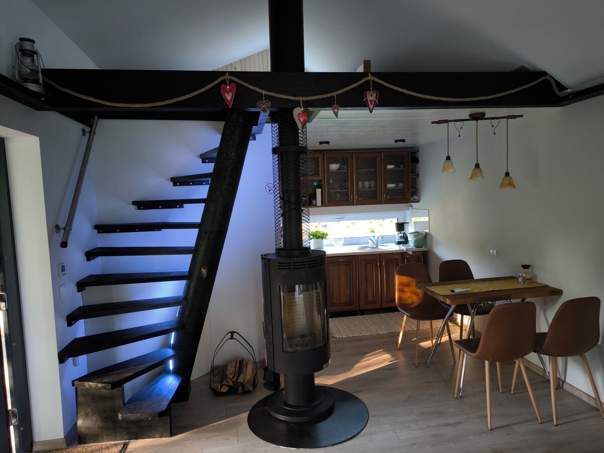 Sala de estar en el primer piso con cama para 2 personas y cocina, ducha, inodoro. Sauna disponible por pago adicional. Segundo piso 1 habitación y 1 lugar para dormir en el segundo piso para 2 personas. Casa al lado del bosque para grandes paseos y descanso. Barbacoa