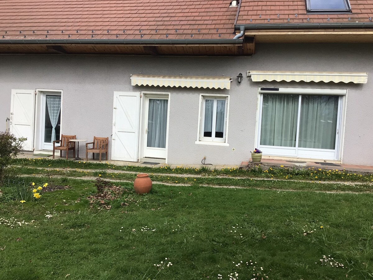 Le studio se situe au RDC de notre maison. Agréable pièce à vivre de 40m carré, de plein pied avec terrasse au sud et vue sur les montagnes . Vous êtes à 15 mn d'Aix les Bains et à 30 mn d'Annecy. A 8 mn en voiture, vous avez des commerces et restaurants à Grésy sur Aix . A disposition, un coin cuisine entièrement équipée , une cafetière Senseo à dosettes souples ,et une bouilloire. Les draps et serviettes de toilettes sont inclus. Idéal pour un couple .