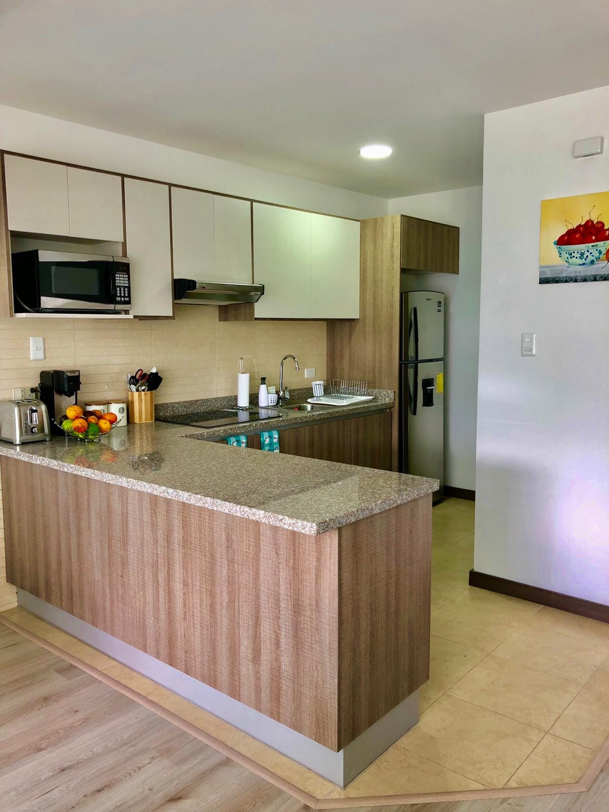 Acogedora Suite con espectacular vista al mar. Internet de alta velocidad. Cuenta con un dormitorio, 1 cama 2 1/2 plazas, 1 cama auxiliar y 1 sofá cama en la sala, TV de 55" y otra TV de 32". Cocina full equipada, 2 baños completos y amplia terraza con vista al mar. Se aceptan mascotas con un recargo adicional a cargo del Resort El Resort cuenta con Restaurant de comida típica junto a la piscina. Parqueadero gratuito y Guardianía 24h.