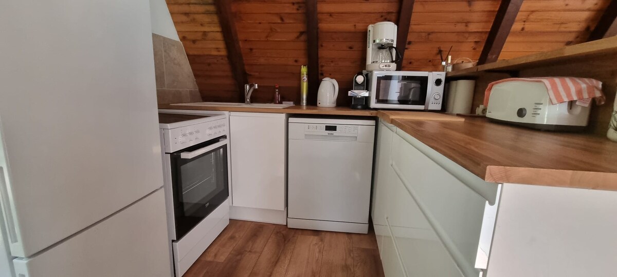 Pasará un buen rato en este cómodo alojamiento. Este gran estudio abierto consta de una cama doble de 140 cm y un pequeño sofá cama de 120 cm, ideal para niños o para uso ocasional. -Gran smart tv de pantalla plana. -Pequeño quemador de pellets que calienta perfectamente la habitación. -Cuarto de baño de tamaño completo. -Cocina totalmente equipada con horno, microondas, doble placa de cocción y fregadero. - Cafetera (Tassimo) -Barra de desayuno para 4 personas.