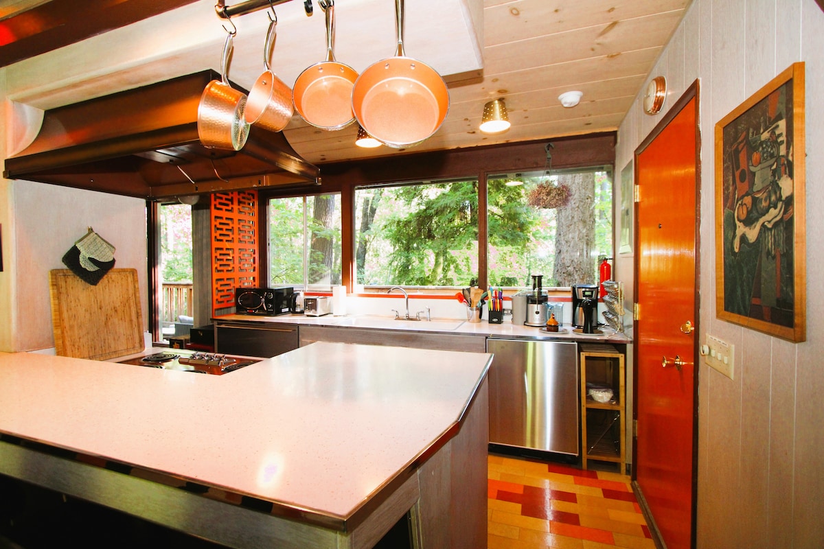 Samadhi’s Birdhouse is a quiet retreat perched atop a tiny peninsula that juts out into the southern portion of Clear Lake reaching toward Mount Konocti [Mountain Woman in Pomo]. Water surrounds you on all sides as birds abound. You’ll see pelicans streaming past; egrets finding their familiar ground; eagles, hawks, and turkey vultures looking down in curiosity. Deer, jackrabbits, and wild turkey graze together while melodic birdsong fills the air.