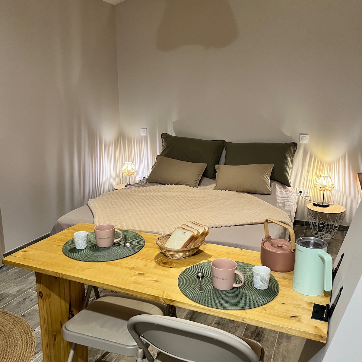 Studio tout équipé, idéal pour un ou deux adultes. Vous pourrez profiter d'une terrasse et jardin privatifs avec vue sur la forêt. De belles choses à découvrir à proximités 😀 : villages, musées, zoo et bien d autres (jettez un œil à notre guide si ca vous dis). Pour les sportifs (même du dimanche 😅) départ sentiers de randonnées au pieds de la maison et même trempette de petons. Pour les travailleurs : 25 min de Tricastin et 30 min de Cruas. Au plaisir de vous recevoir, Johan et Stéphanie