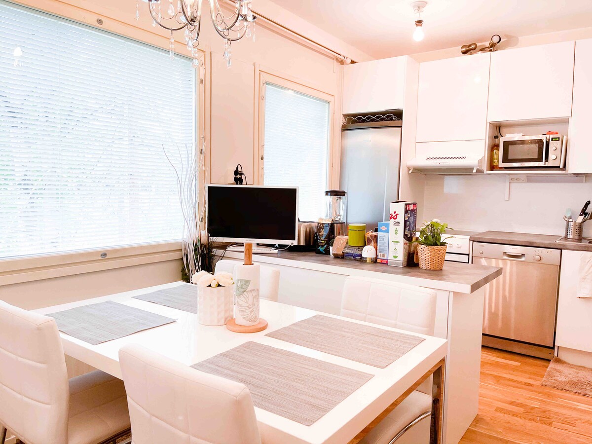 ENGLISH pride of the East is such a beautiful cosy and always SANITISED apartment. The 80 m'2 space has 3 bedrooms with 1 living room. Beautiful, stylish and expensive furniture (indecoria). large kitchen area with a dining table. All white colour fittings. Smart TV in every room for comfort. Beautiful view to the road from the balcony. FINNISH Kaunis ja tilava huoneisto, valtava tila (80m2'), kaunis näkymä tielle ja valtavat ikkunat, joissa on enemmän auringonvaloa ja hyvin tuuletusta,