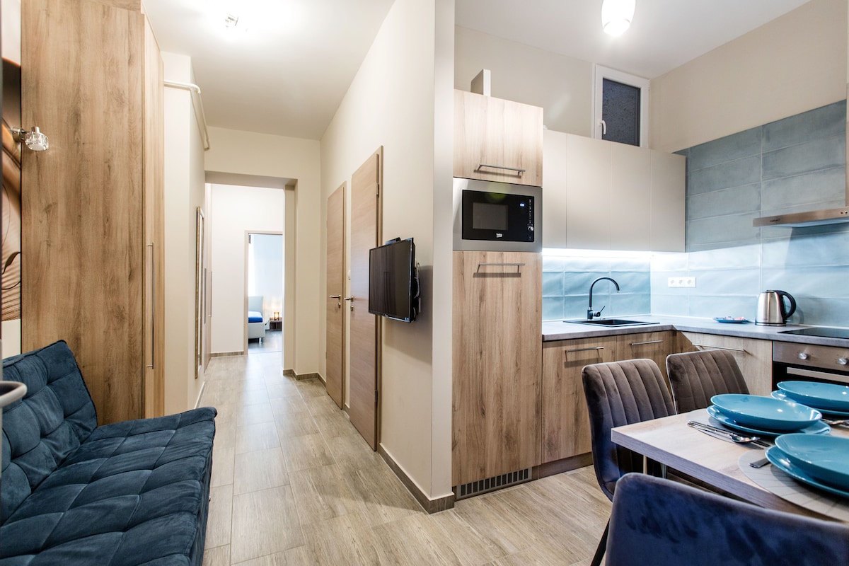 Bienvenido a nuestro acogedor apartamento en un complejo residencial diseñado al estilo italiano. Este alojamiento es perfecto para aquellos que valoran la paz y la comodidad. La característica principal es un amplio balcón con jacuzzi, ducha al aire libre, tumbonas y zona de comedor. El complejo está rodeado de tiendas, incluidas las que están abiertas las 24 horas, y cafeterías. La práctica ubicación ofrece fácil acceso al transporte público, lo que te permite llegar rápidamente a cualquier punto de la ciudad. Nuestro apartamento es tu acogedor refugio en la ciudad.