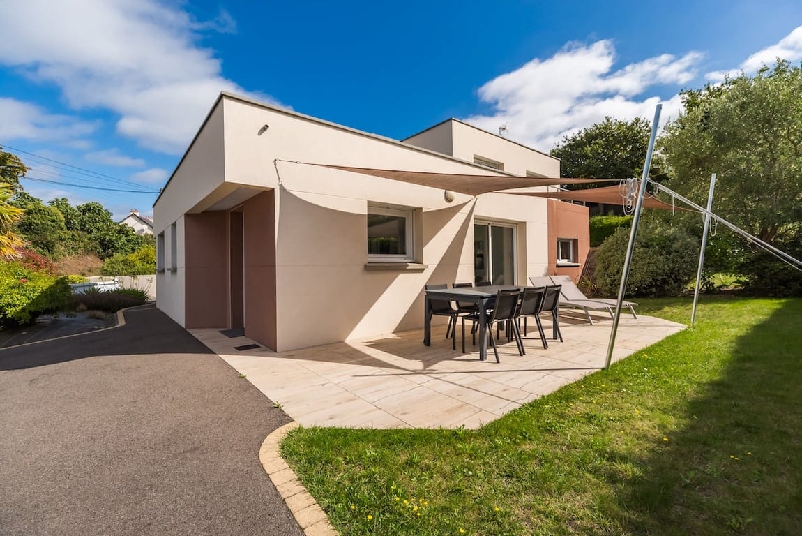 Encantadora casa con una ubicación ideal para pasar unas vacaciones agradables y fines de semana con familiares o amigos. Vista al mar. ¡Conveniente! Ubicado en el camino de senderismo a pie "Gr 34", tienes acceso directo a la playa "Godelins" (200 metros) para salidas a la casa para tus actividades como natación, remo, pastilla de lomo, kit-surf, etc. El centro de la ciudad está cerca con tiendas y mercados.