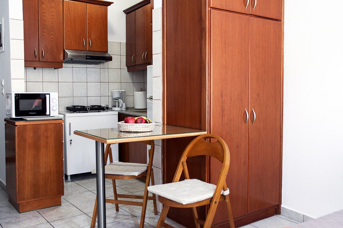 This cozy 75sqm apartment is a place to feel at home and create beautiful memories. It features two inviting bedrooms with double beds and orthopedic mattresses, a fully equipped kitchen, and a bright living room with a large sofa, Smart TVs, home cinema, and fast 500 Mbps WiFi. Silent air-conditioning keeps you comfortable through the Greek summer, while a washer and dryer make long stays easy. The wraparound balcony is perfect for coffee, laughter with friends, or a peaceful evening breeze.