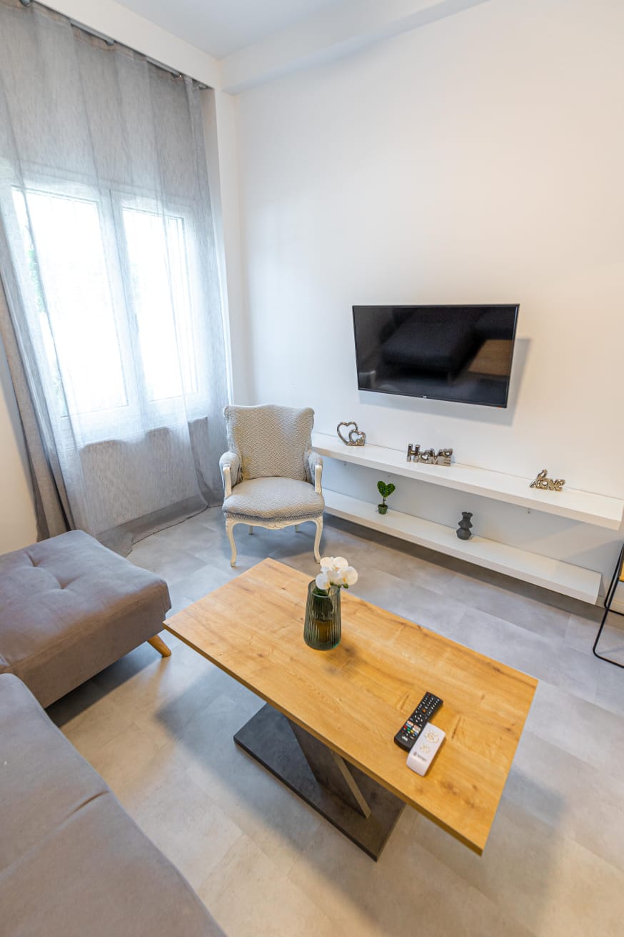 This cozy 75sqm apartment is a place to feel at home and create beautiful memories. It features two inviting bedrooms with double beds and orthopedic mattresses, a fully equipped kitchen, and a bright living room with a large sofa, Smart TVs, home cinema, and fast 500 Mbps WiFi. Silent air-conditioning keeps you comfortable through the Greek summer, while a washer and dryer make long stays easy. The wraparound balcony is perfect for coffee, laughter with friends, or a peaceful evening breeze.