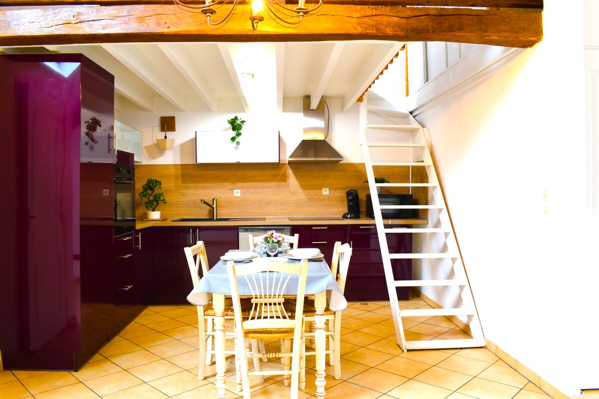 Apartamento de 35 m2 decorado con buen gusto. Bañera Balneoterapia con 2 plazas una al lado del otro. A la italiana espíritu industrial Zona de comedor interior / exterior Microondas y refrigerador, vajilla y cubiertos. Sin fogones Se proporcionan sábanas y toallas. Techo de 3,5 m que acoge una decoración insólita Ideal lugar para disfrutar en pareja