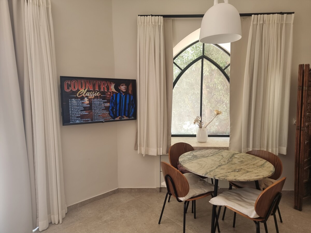 Experience Jerusalem from a serene, refreshing home base. Charming 30 sq m apartment in the heart of Ein Kerem, the most delightful neighborhood of Jerusalem with nice cafes, surrounded by lush nature and ancient terraces. Softly renovated, the bedroom provides an elegant arched ceiling dating back to the 1890s. Jerusalem Stone walls lend a unique ambiance. Private roof top with stunning views of the St John´s Church. Ideal for a couple and an infant, with a warm and welcoming host family