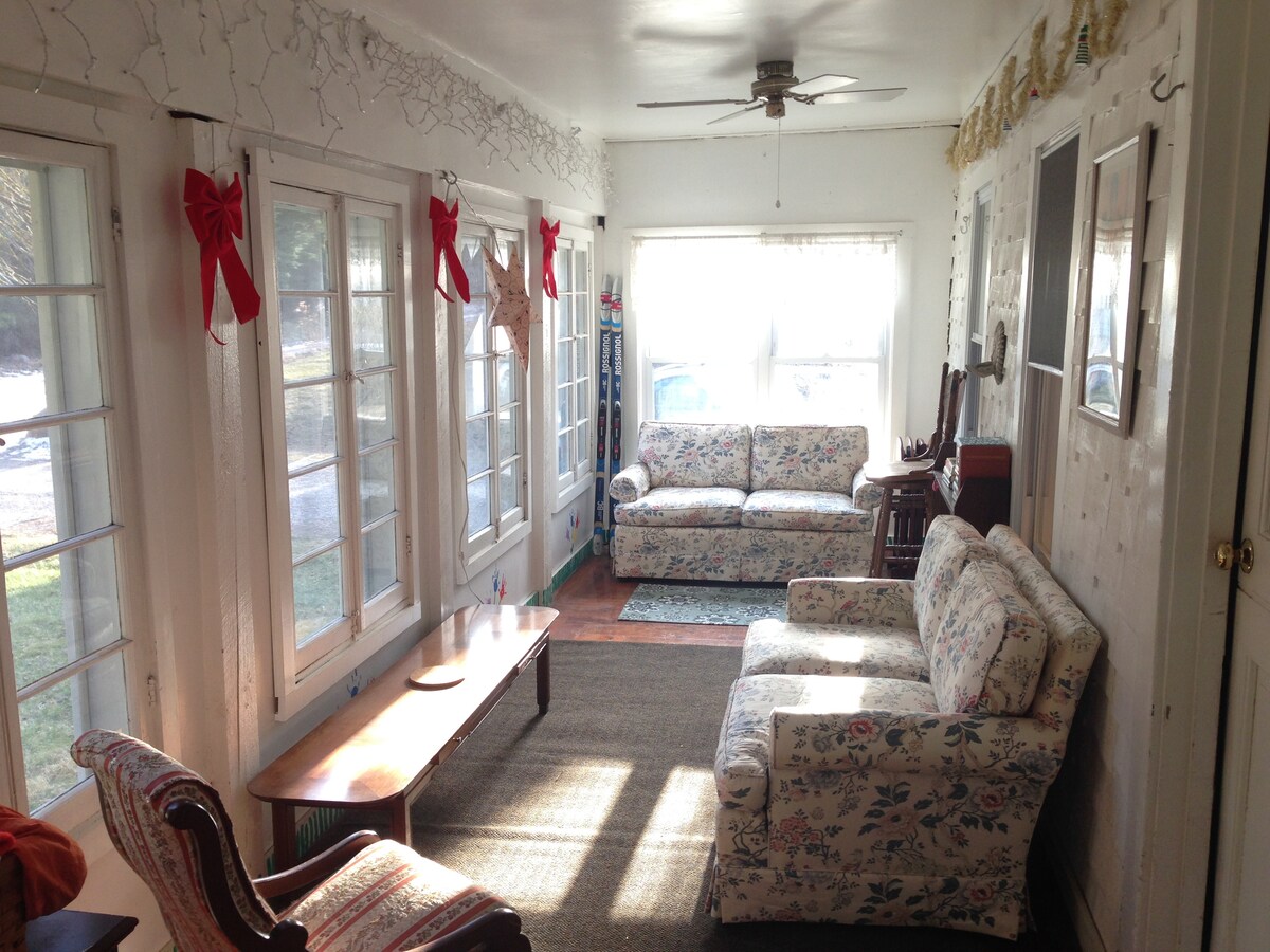 "Ellis" is a fully heated/winterized camp cottage built in the 1960's by the students of Ellis Tech. It has two bedrooms and sleeps 5. The detached bunkhouse has 3 single beds and is available for larger groups (summer only) Very peaceful lakeside location just 238 feet from Beach Pond. Walking distance to trails. Enjoy the quintessential lakeside vacation! This is not a secluded space so make sure to look at the photos to see the layout of other nearby buildings. Please read all the details!