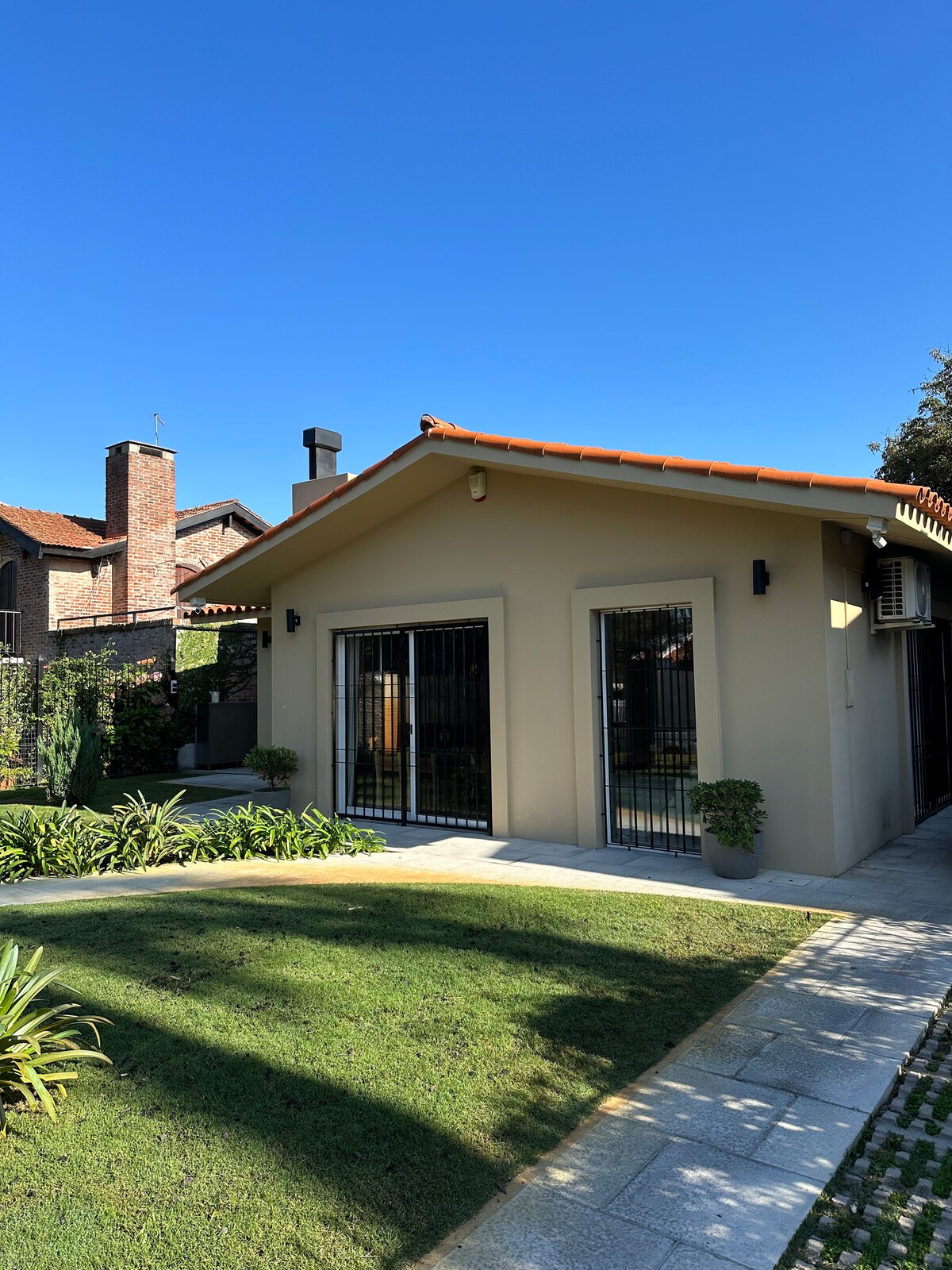 Casita del fondo 30 m2, entrada independiente, un dormitorio con sommier plaza y media, placard amplio, 2 equipos de aire, buena iluminación, baño completo en suite, living , barra alta, estufa leña, cocina integrada y equipada. A una cuadra del Centro Comercial de la zona de restaurantes, heladería, paseo de compras, farmacia, supermercado, plaza de juegos. La casa está toda cercada con rejas. Porton de entrada con control remoto se comparte con la casa principal. Inc agua y wifi, luz aparte.