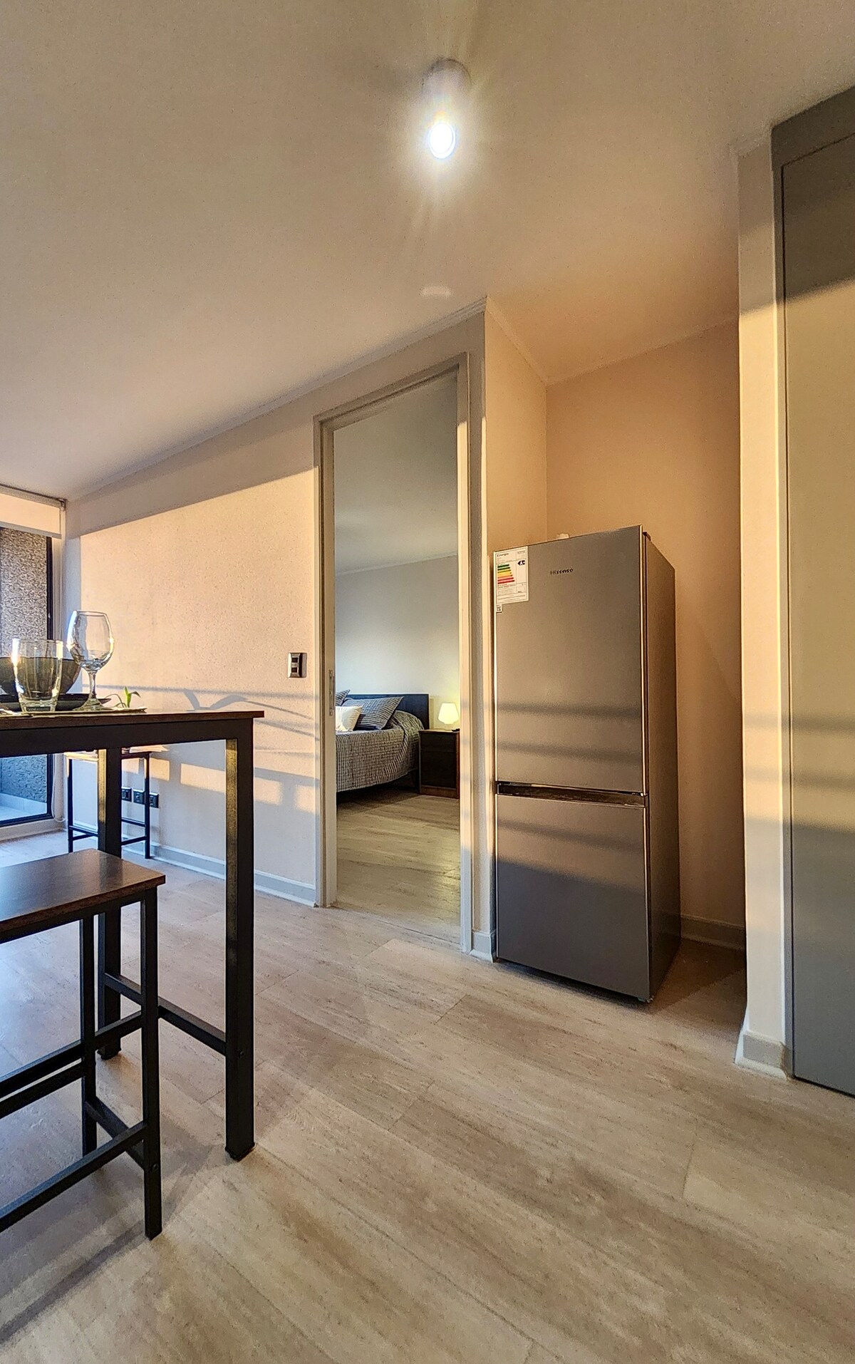 Un departamento nuevo, moderno, muy luminoso y completamente equipado, ubicado en un edificio de alto estándar. El departamento destaca por su diseño acogedor, su excelente iluminación natural y una decoración cálida estilo contemporáneo. Ubicado en una zona estratégica de Santiago Centro, tendrás todo a minutos caminando: Parque O’Higgins, Fantasilandia, Movistar Arena, supermercados, cafés, locomoción, universidades y acceso rápido a la Autopista Central.