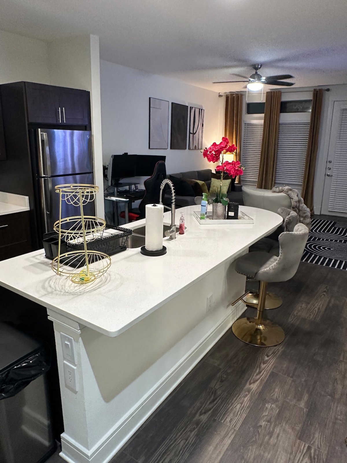 Perfecto para el profesional que trabaja o la pareja que busca una escapada relajante. Cerca de tiendas, restaurantes y aeropuertos. 2 dormitorios, 2 baños, cocina completa y lavadora/secadora. Capacidad para 6 personas con el sofá cama, 3 televisores inteligentes con barra de sonido. La unidad de nivel principal sale al sendero que rodea la propiedad y se conecta con Mercer Park. Dos increíbles piscinas, un gimnasio y una gran sala de estar con juegos y mesa de billar. No se admiten mascotas ni se permite fumar ni vapear.