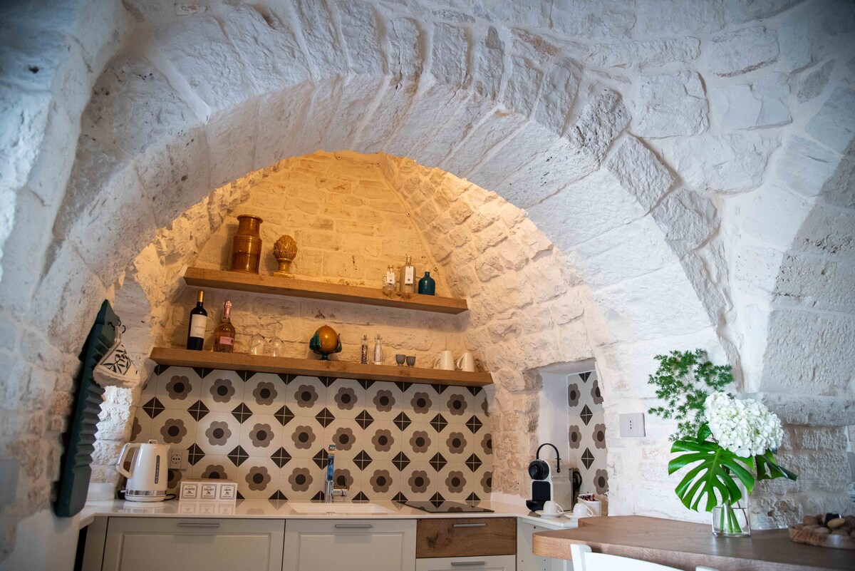 Un lugar moderno y atemporal, hecho de momentos de asombro, donde la antigua tradición de los maestros «trullari» se combina con la elegancia y la funcionalidad de ambientes cuidados, equipados con todas las comodidades, para regalarte una verdadera experiencia de la vida en Apulia. Estructura compuesta por 5 conos con 2 dormitorios (cama king size y cama francesa), calefacción por suelo radiante, cocina con nevera y placa de inducción, baño con ducha emocional y jardín.