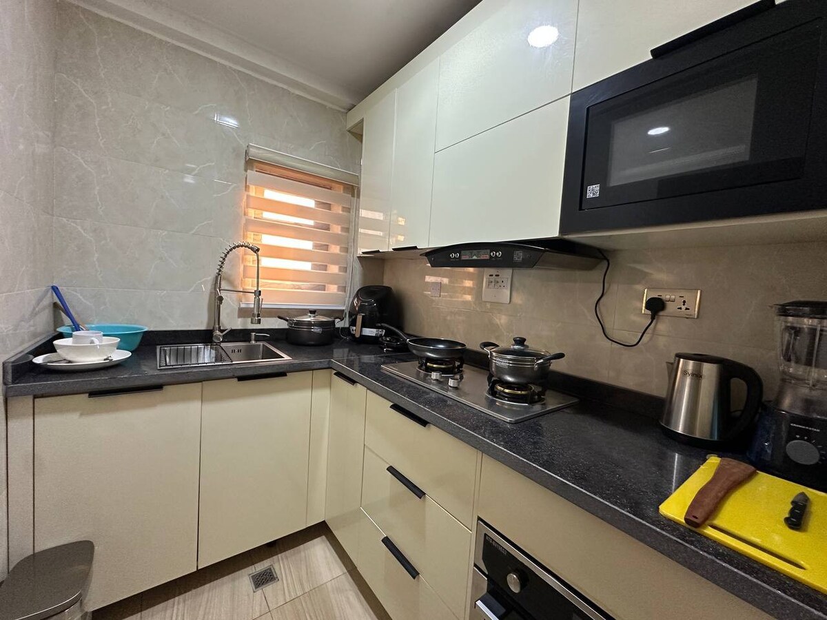 Serene environment with pleasant refreshing atmosphere. 2mins to groceries store, hospital and 15mins drive to International airport. 7mins drive to town. VIP and VVIP lounge available in the premises. Pool still under construction. A place one can call home away from home. Kitchen utensils available