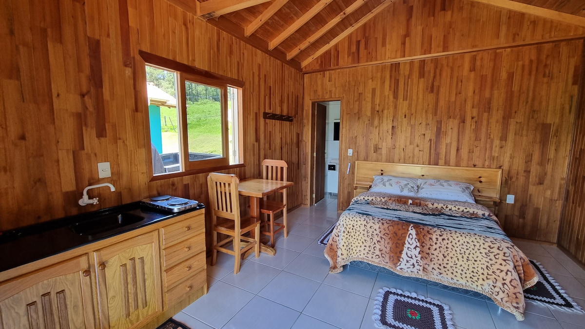 Cabana com lareira, cozinha e café da manhã