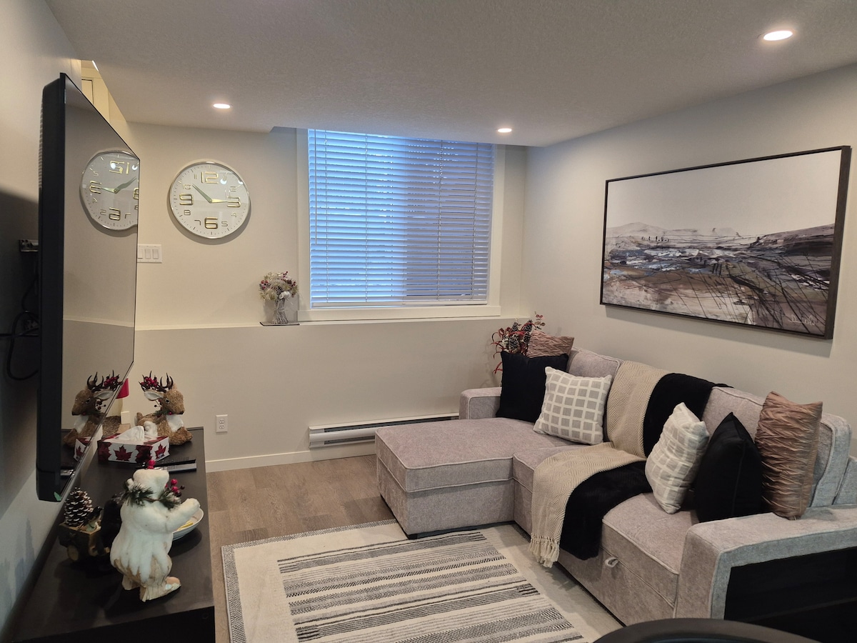 Welcome to this stylish 2-bedroom basement suite in Calgary’s serene Silver Spruce area. Enjoy a cozy living room with a large TV and electric fireplace, a sleek kitchenette with stainless steel appliances, and a full bathroom. This modern suite offers comfort, convenience, and a peaceful ambiance, perfect for families or professionals. Located close to amenities, it’s an ideal spot for relaxation after a day of exploring or working in the city.