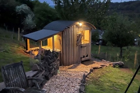 Get away from it all in a cosy shepherd’s hut amongst trees in a beautiful rural location. Tom's Hut has a comfortable double bed, storage below and a compact kitchen unit with double gas hob, sink and fridge, pots, pans crockery and cutlery. Keep warm with a wood-burner and fire wood provided, or underfloor heating. Outside, there is a table for al-fresco dining. A newly built, heated shower room is close to the hut. Just 3 miles from Newent and various pubs. Please note there is no WiFi.