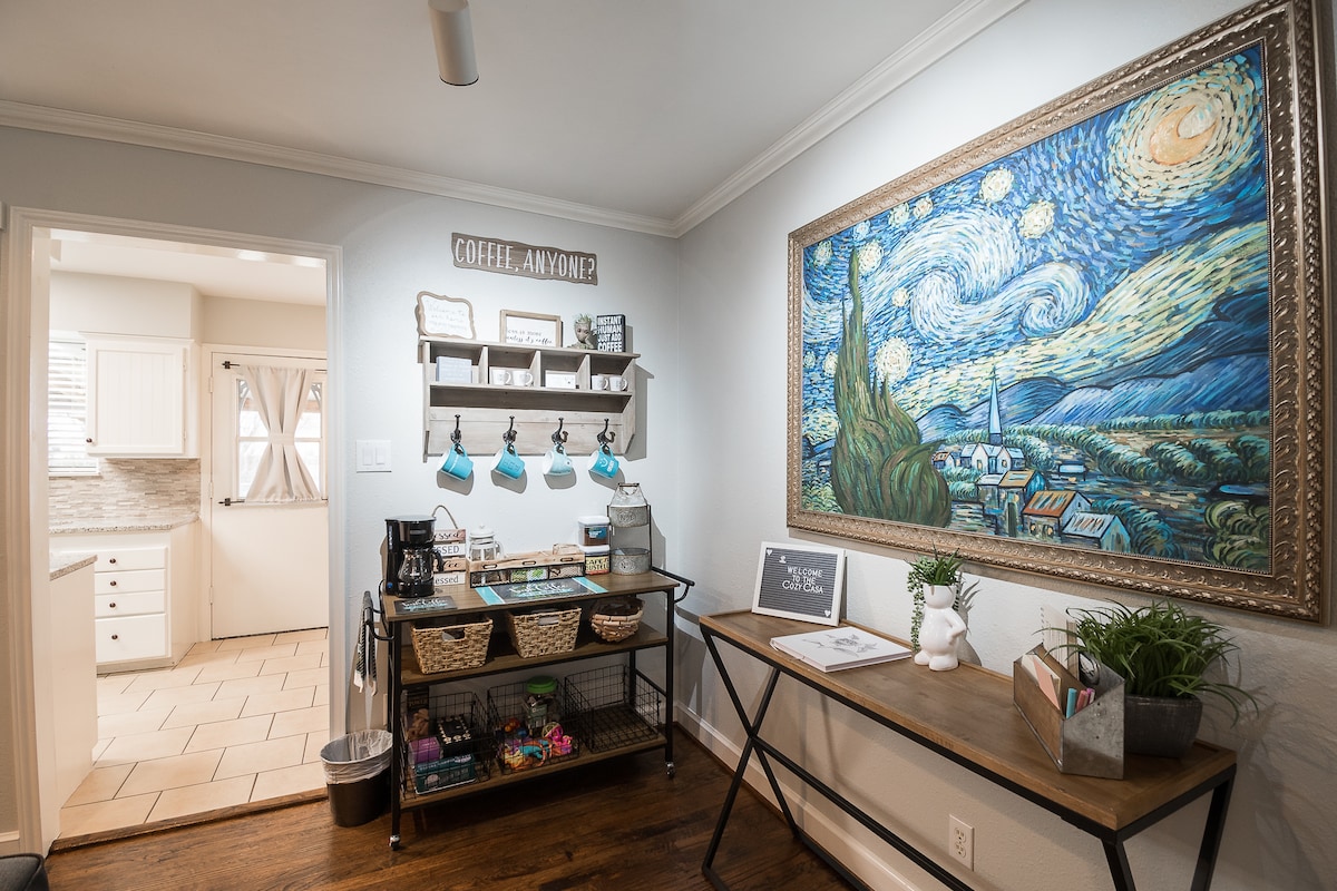 **LONG STAYS WELCOME** Come relax in this charming Cozy Casa with 3 bed 1.5 bath home with a wood covered deck, original hardwood floors and a full size washer and dryer.There is a desk for the those who need a work space. Smart TVs in each room with Hulu and Netflix...WIFI too!! Coffee Station too!! . The house is within walking distance or short drive of several restaurants and shopping. Approximately 20-25 minutes from downtown Dallas.