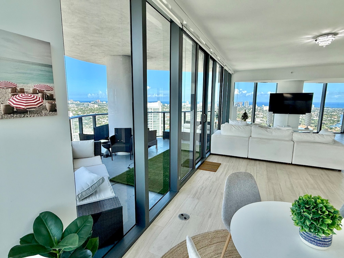 Apartamento de lujo en el piso 12 de W Residence. Totalmente amueblado, 2 dormitorios/2 baños con vistas panorámicas de 180° a la ciudad y al Intracoastal, además de una hermosa vista lateral al mar desde el balcón y la sala de estar. Cocina moderna con electrodomésticos de alta gama, lavadora/secadora en la unidad. Servicios de estilo resort: servicio junto a la playa, piscinas, jacuzzi, spa, gimnasio y bar en la sala de estar. Cena en Steak 954, El Vez y Sobe Vegan, a solo un viaje en ascensor. A pasos de W Water Taxi, tiendas, vida nocturna y la playa.