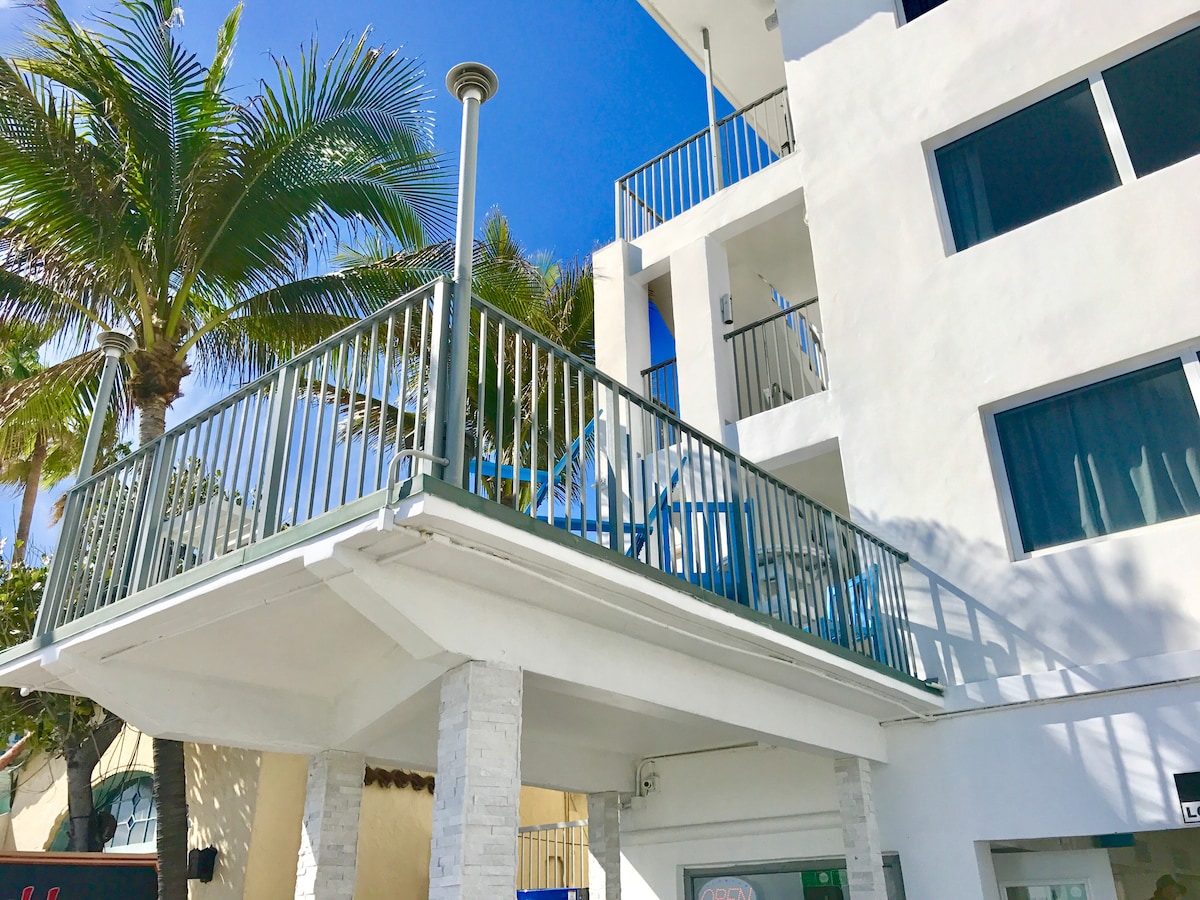 Somos un hotel boutique frente al mar como los de South Beach. La suite frente al mar es una espaciosa de 450 pies cuadrados, con una pequeña cocina y vistas panorámicas al mar; ¡lo mejor de lo mejor! Tenemos una azotea al aire libre abierta hasta las 22:00, un patio al aire libre abierto las 24 horas del día, los 7 días de la semana, y nuestra propiedad está asegurada. Tenemos equipo de playa gratuito, wifi gratuito y 1 plaza de aparcamiento para un COCHE PEQUEÑO a 10+tx/día. Somos un hotel tranquilo y relajado. Bares y restaurantes a poca distancia a pie. El huésped principal debe ser mayor de 21 años, así que las familias no tienen que preocuparse por el ruido.