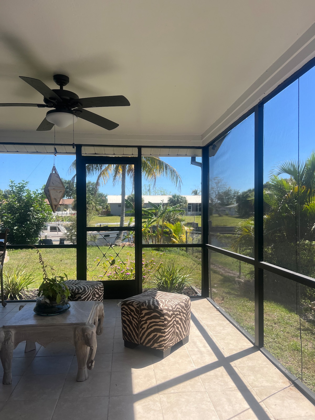 Spacious and gorgeous 4 bedrooms & 2 bath Vacation house with 1 King, 3 Queens, 2 Fulls, 1 Twin, 1 sofa queen bed. it fits up to 12 people easily. Dreamed coastal-themed home. Prestigious private Heated pool, and canal access (park your own small boat or Jetski). Go fishing at the Caloosahatchee River (Just an 8-minute boat drive from the home).