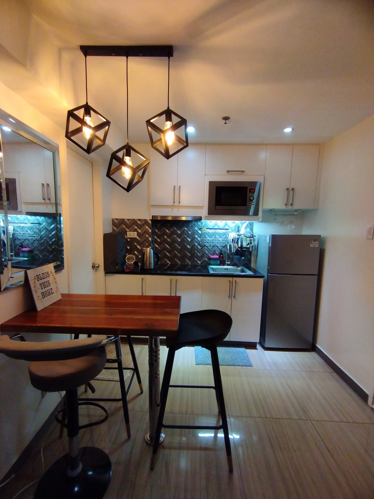 Apartamento de 1 dormitorio recién renovado de 67 metros cuadrados en el corazón de BGC, pero aún así muy tranquilo y silencioso. Esta solía ser nuestra casa antes de que nuestra hija creciera demasiado y ahora estamos encantados de compartirla contigo. Smart TV de 65 pulgadas, wifi gratuito de 60 Mbps y Netflix incluido. Diseñado por uno de los principales arquitectos de Manila y totalmente equipado con electrodomésticos y muebles de alta calidad. Bancos, farmacias y 7/11 están a menos de 1 minuto. A 5 minutos a pie del centro comercial SM Aura y de la calle Bonifacio High.