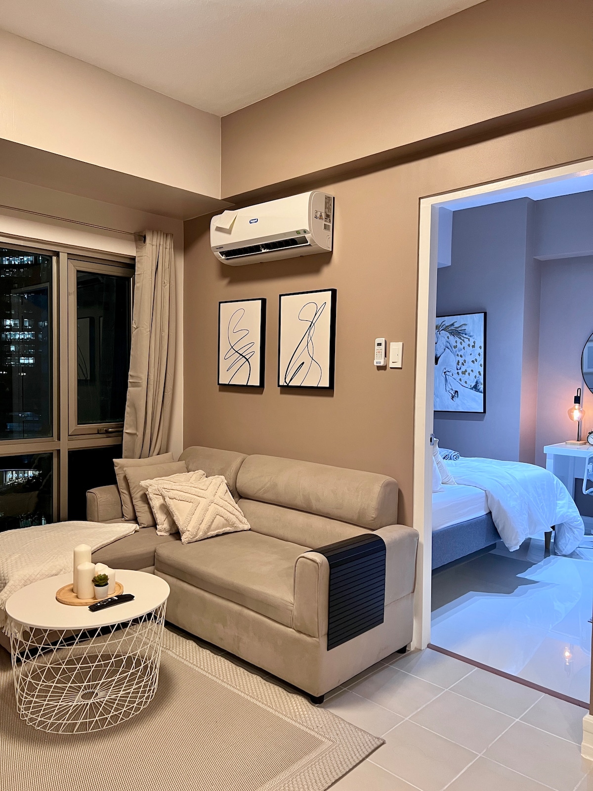 The whole group will enjoy easy access to everything from this centrally located place. Our freshly renovated unit features a spacious living area, a comfortable dining space, and a well-equipped kitchen—perfect for families or groups of friends. The master bedroom includes an en-suite bathroom and a large window with a stunning city view. Everything you need is just a few steps away, including banks, restaurants, convenience stores. Near SM Aura, Bonifacio High Street & Mind Museum.