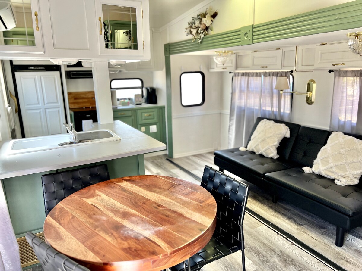 Esta es una quinta rueda más antigua, perfecta para aquellos que buscan un alojamiento básico, limpio y económico. No es lujo, pero tiene lo esencial: un colchón queen, un sofá que se convierte en una cama, una cocina sencilla, baño y cómodos arreglos para dormir para 2 personas. El alojamiento se mantiene fresco y climatizado con un sistema mini split para tu comodidad. Ten en cuenta que se trata de una casa rodante más pequeña de unos 25 pies.