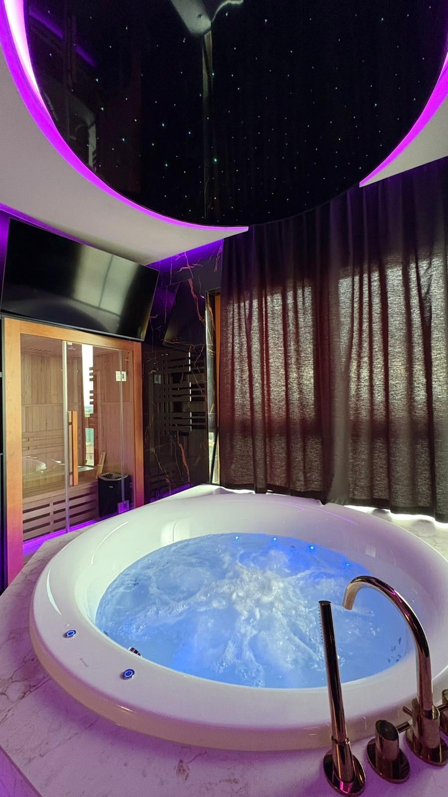 Casa de cristal con jacuzzi, sauna y vistas a la ciudad