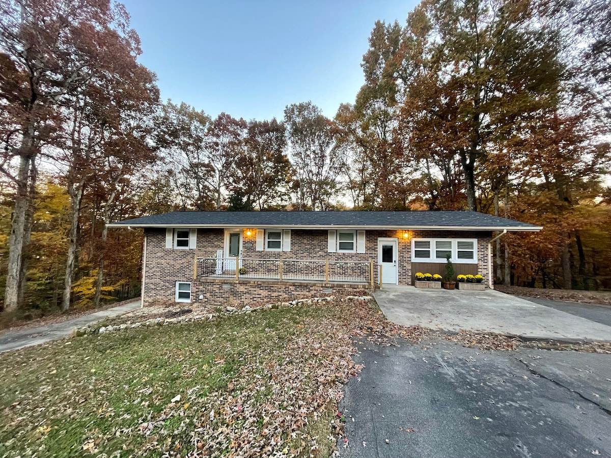 Perfect family friendly get-away at Tims Ford Lake. The cottage is located on a beautiful, completely wooded lot. You have access to Holiday Landing Marina via a subdivision golf cart path. Whether you want to go boating on the lake, hike at the nearby Tims Ford State Park, or just get together with family and friends, look no further! This large open concept, cozy, spacious, 3-level home is all you will need. Brand new furnishings and mattresses! Our space also includes 5 large 4K ROKU TVs.